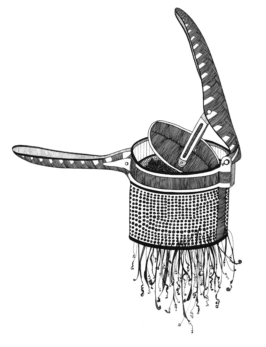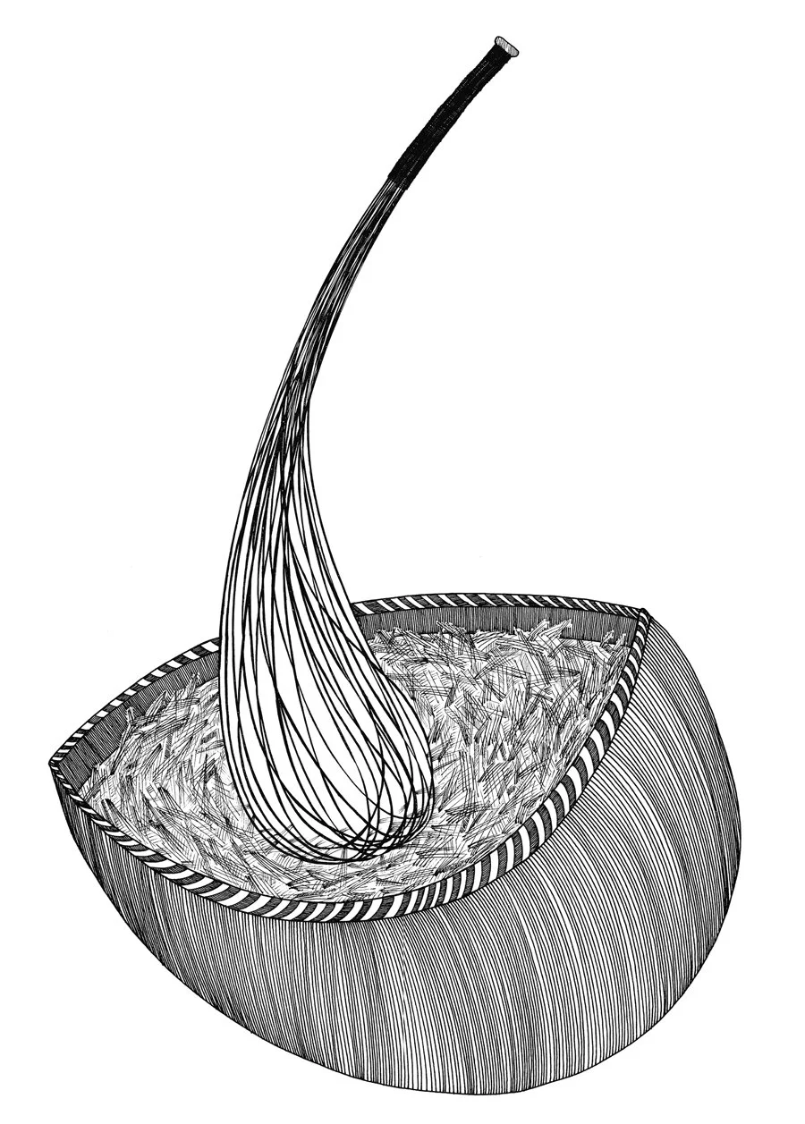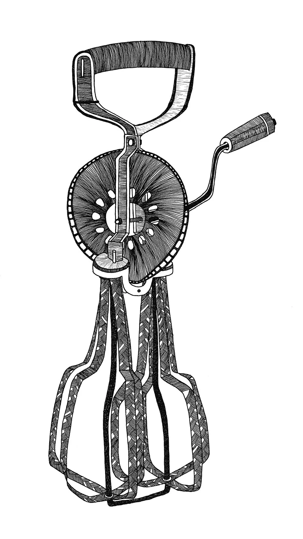 My drawings of kitchen tools are metaphors for the ways in which English and Spanish are mixed to create new words, rhythms, and forms of speech. Ingredients are processed through kitchen utensils to create food in ways symbolic to how words are constructed and de/reconstructed between two languages to produce new words and meanings. Words, like foods, are spliced and diced, mixed, blended, weighed, recombined, and ultimately transformed. In language, as with image, there is much invention. I use appliances- like languages and words- to create sustenance for body and spirit on multiple planes at once physical, emotional, psychological.