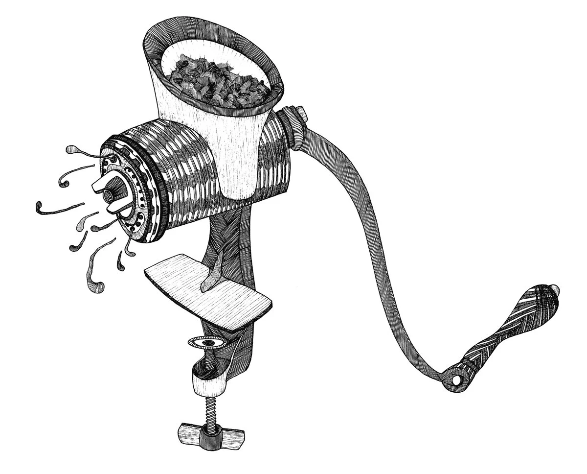 For example, al comprimir / upon pressing and exprimirdora / squeezer refer to the challenging act of translating: a material enters a receptacle and emerges changed by virtue of its having passed through hundreds of holes, or filters. Likewise, exact translations between English and Spanish (or any two languages for that matter) are often lacking in sentiment, while translations that are true to the essence of a message are often not exactly literal. midiendo la masa / weighing the maize represents the weight words carry in different contexts, a skill useful in both multilingual and monolingual spheres. amasando la masa / rolling the maize speaks to the difference in general standards of beauty and effectiveness in two languages, with English often being praised when it is tight, edited, and concise while Spanish is stretched via its expansive vocabulary, known generally as a very ‘flowery’ language that inspires long and deliciously complex sentences. moledora moliendo / grinder grinding enacts through the body of a meat grinder the process of creating Spanglish verbs, formed by combining English infinitive verbs with the Spanish suffixes. To park, instead of being estacionarse becomes parkear. Seemingly infinite combinations of root words and verb endings create these hybrid action words. granulando / crushing refers to the power of the diminutive forms of speech so common in Spanish: the –itos and –itas attached to the endings of words. The pepper crusher takes a relatively large chunk of spice and pulverizes it, so as to imbue an entire dish with its flavor. Likewise, the –ito or –ita added to a word can imbue the sentiment in Spanish with much affection, or, depending on the delivery of the speech, a wide variety of emotions. batidora / beater and batiendo / whisking make jarring or swift back-and-forth actions, mixing materials that mimic the way phrases in Inglés y Español switch at times at a fast pace, cambiando one way y luego el otro to build full sentences, thoughts, and phrases reminiscent of code switching.